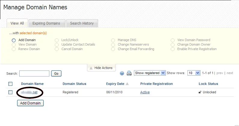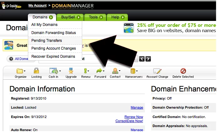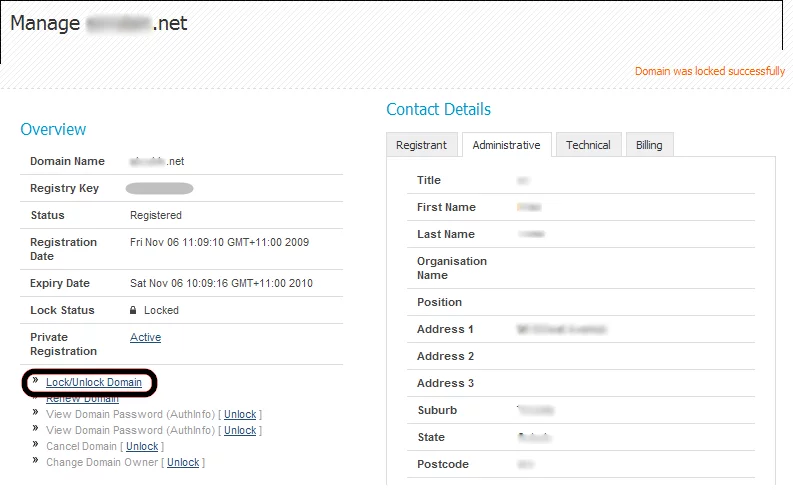 Click on the domain to be transferred again, then select ‘Lock/Unlock Domain,’ at the next screen click ‘Unlock Domain.’ The lock status should now say ‘Unlocked