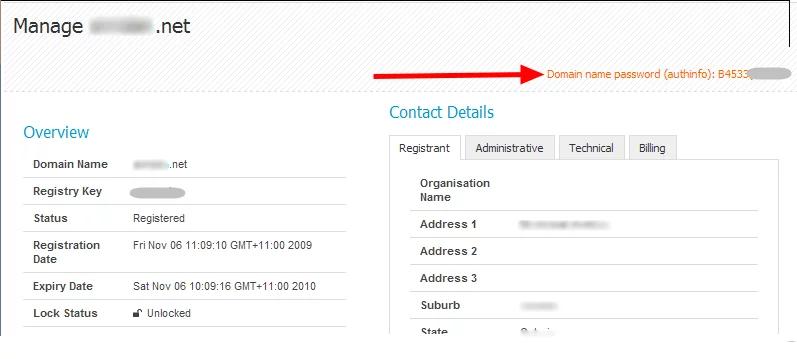 Select ‘View Domain Password (AuthInfo), the Auth code will be displayed in the top right corner, make note of this number. You will need it to confirm the transfer.
