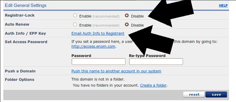 From ‘Domain Overview’ click on ‘General Settings’ and make sure that ‘Registrar-Lock’ is set to ‘Disable,’ then select ‘Email Auth Info to Registrant’ and click ‘Save’