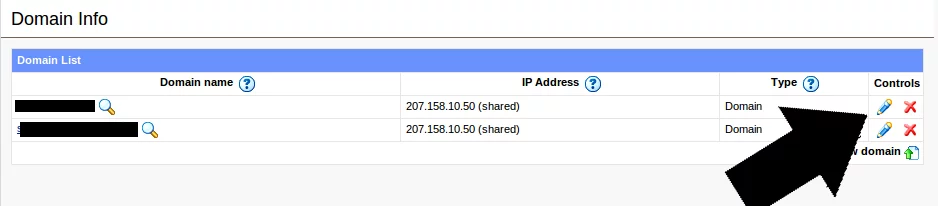 Once under the ‘Domain Info’ screen, click the pencil next to ‘DNS configuration’ to edit the DNS settings of this domain.