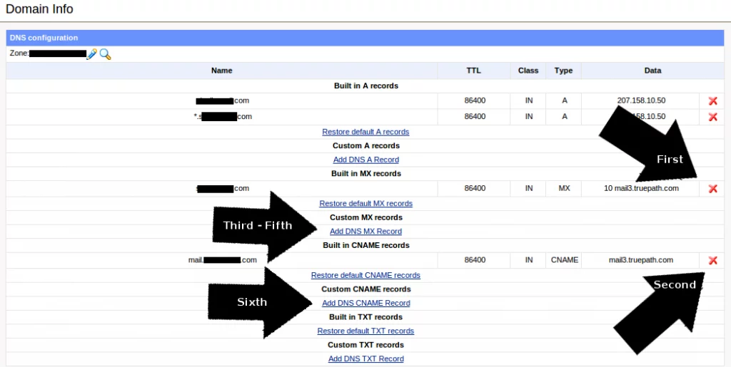 Delete the default MX record and default CNAME record by clicking the red X next to them (refer to the arrows marked with First and Second)
