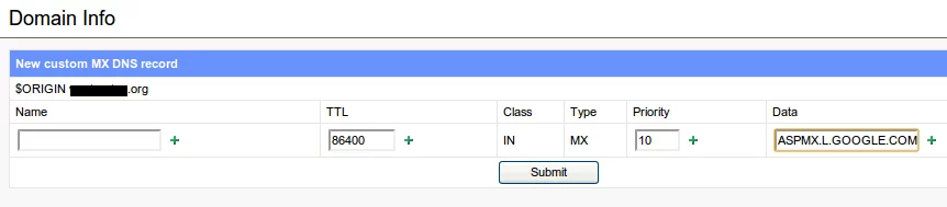Then, click ‘Add DNS MX Record,’ you will need to repeat this step three times with each of the required MX values