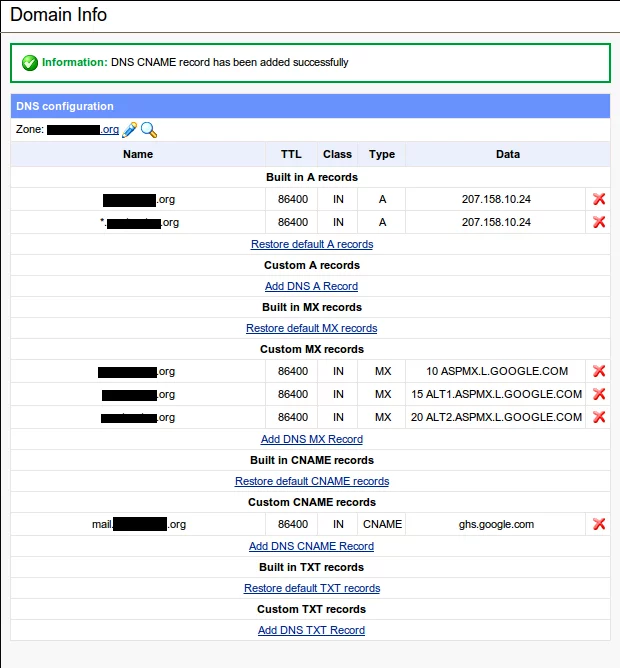 Select the domain at which the Google Apps email is located by clicking the pencil icon to the left of the red X (for example would require you to edit exampledomain.com)